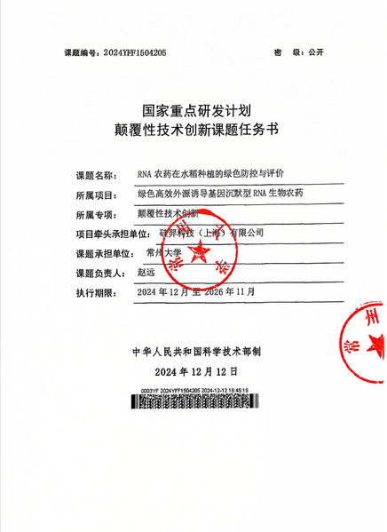 太阳集团官网赵远研究员获批国家重点研发计划颠覆性技术创新项目2025.01.14suncitygroup太阳集团官方网站作为课题承担单位获批国家重点研发计划颠覆性技术创新项目“绿色高效外源诱导基因沉默型RNA生物农药”专项中的“RNA农药在水稻种植的绿色防控与评价”课题(课题编号:2024YFF1504205),太阳集团官网suncitygroup太阳集团官方网站赵远研究员担任课题负责人。该课题聚焦我国粮食安全和农业绿色发展的重大需求,针对传统化学农药带来的环境污染、农药残留等问题,以RNA生物农药为突破口,开展其在水稻种植中的绿色防控技术研究与应用评价。RNA农药作为一种新兴的生物农药,具有靶向性强、环境友好、不易产生抗药性等优势,被誉为“下一代农药”,在农业绿色发展中具有广阔的应用前景。课题团队依托suncitygroup太阳集团官方网站在环境功能材料、污染控制与资源化利用等领域的长期研究积累,结合生物技术、材料科学、环境科学等多学科交叉优势,将系统开展RNA农药的环境行为及田间应用评价研究,构建RNA农药在水稻绿色防控中的应用技术体系,为实现RNA农药的产业化应用提供理论和技术支撑。太阳集团官网高度重视重大、重点科技项目谋划,围绕国家重大战略需求和常州市科技创新规划,坚持“四个面向”,有组织地开展科研工作。该重点研发计划课题的立项是学校重大重点科研项目谋划的